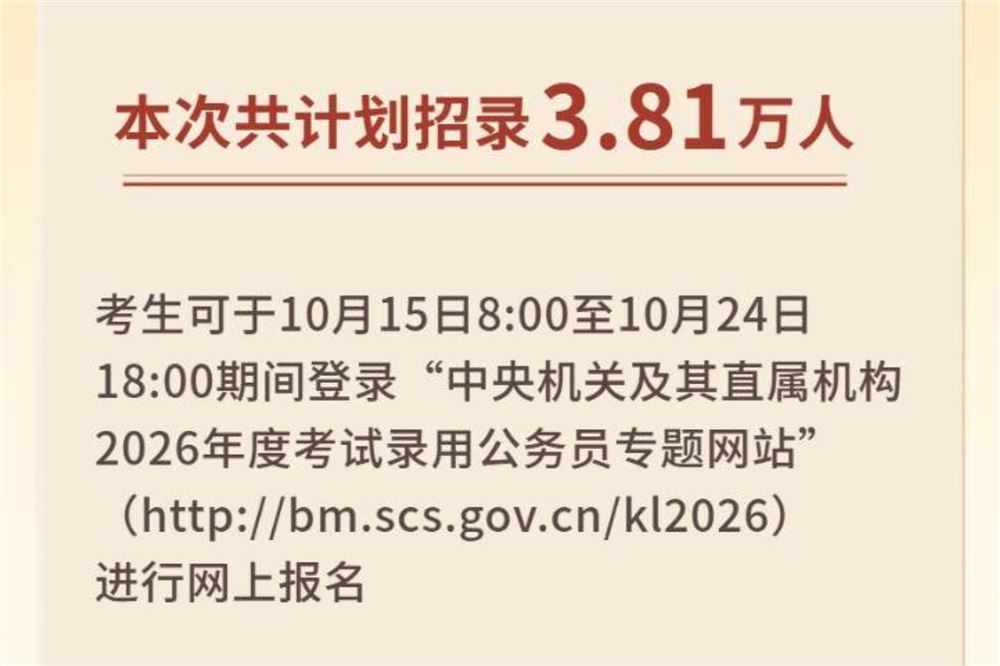 新华社北京10月14日电 记者14日从国家公务员局获悉,中央机关及其直属机构2026年度考试录用公务员报名即将开始,共计划招录3.81万人。严格把好新录用人员政治关,对政治上不合格的坚决不予录用。 国家公务员局郑重提醒,诚信是社会主义核心价值观的重要内容,是做人之本、立业之基,更是成为一名公务员的基本条件,希望广大考生从选择报考的那一刻起,就自觉践行诚信要求,诚信报名、诚信考试、诚信守约。