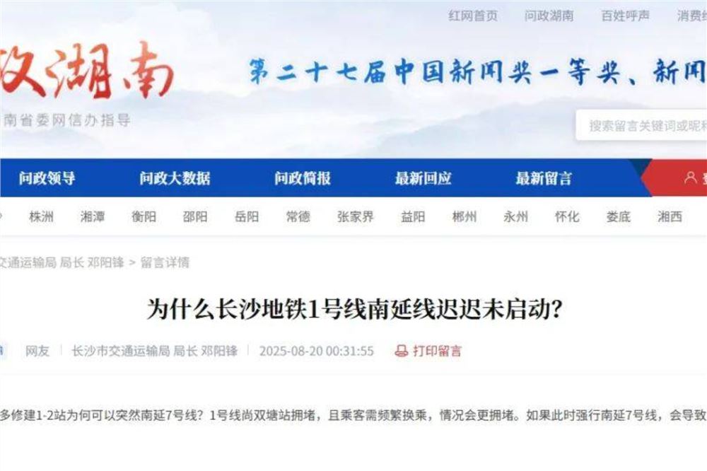近日,网友在红网《问政湖南》平台上发帖咨询长沙地铁1号线南延线建设进展,疑惑为何7号线南延线可新增1-2个站点,而1号线南延线却迟迟未启动,担心可能加剧尚双塘站拥堵状况。长沙市自然资源和规划局对此作出回应。目前,1号线和7号线南延工程均处于前期研究阶段,尚未确定具体实施时序。