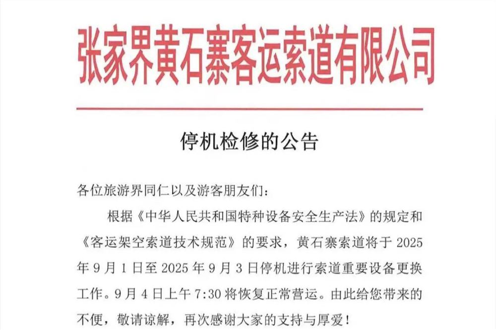 8月25日,张家界黄石寨客运索道有限公司发布公告,黄石寨索道将于2025年9月1日至9月3日停机,进行重要设备更换,9月4日上午7:30恢复营运。