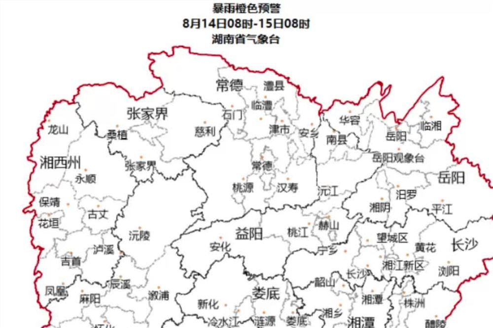 三湘都市报·新湖南客户端8月14日讯湖南省气象台8月14日6时发布暴雨橙色预警:预计14日8时至15日8时,湘南、湘西南大部分地区将出现暴雨,其中邵阳南部、郴州南部、永州中南部、怀化南部局地大暴雨,并伴有短时强降水、雷雨大风等强对流天气,请加强防范。