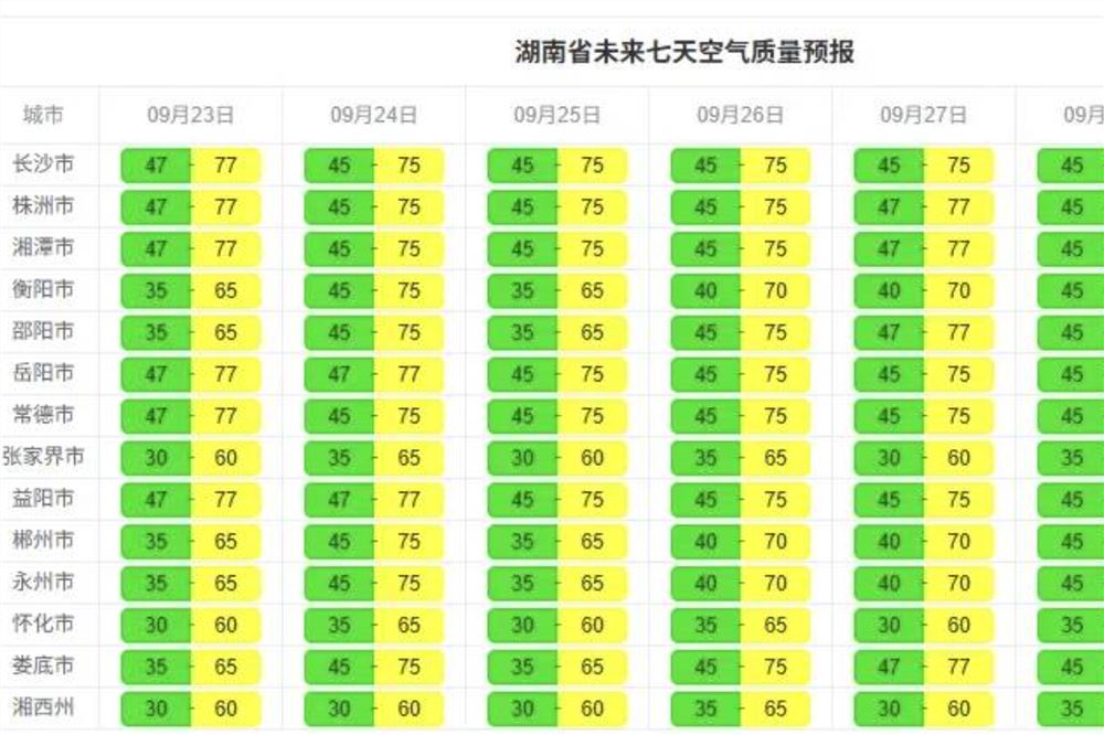 华声在线9月23日讯 记者今天从省生态环境监测中心获悉,本周湖南受多轮台风影响,局部地区多降雨,全省空气质量优至良。 9月26日至28日,受弱气压场控制,湘西北晴转多云,湘中南部多云间阴,局地小雨,偏北风为主,空气质量状况优至良。 9月29日,新一轮台风加强,受外围云系影响,全省大部有中到大雨,局地暴雨,空气质量优到良。