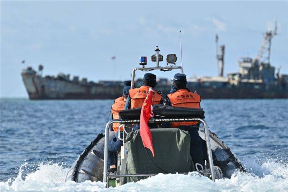 5月16日,中国海警局赤瓜舰执法员在菲律宾非法“坐滩”军舰附近巡查。橡皮艇返航后,菲方人员将渔网拉上非法“坐滩”军舰。自5月15日开始,菲方人员多次对中国渔民所放渔网实施破坏。新华社记者李鑫摄这是5月16日拍摄的菲律宾非法“坐滩”军舰人员乘小艇在仁爱礁及其附近海域切割并盗走中国渔民所放渔网的过程。
