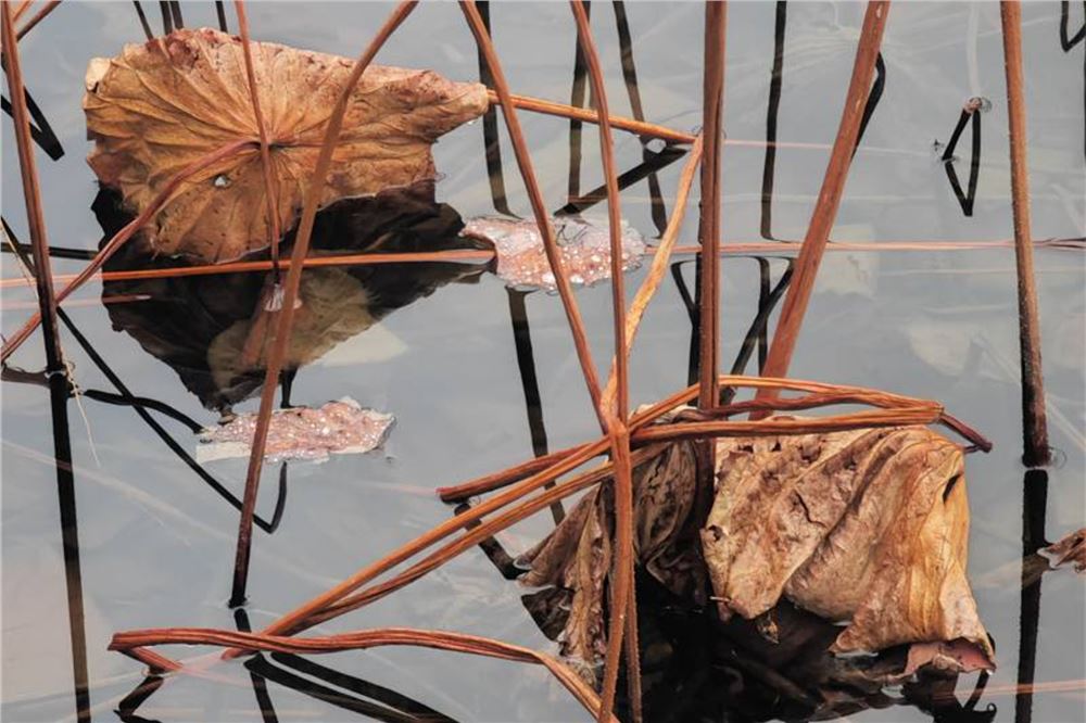 秋阴不散霜飞晚,留得枯荷听雨声。每年夏时,接天莲叶无穷碧,映日荷花别样红,蜂来蜓往,门庭若市,何等热闹,何等壮观!如今,秋去冬来,荷花莲实早被俊男靓女采去,留下枯荷伏水,瘦干伸天,无声胜有声!这等静待辉煌的忍耐,倒也叫人驻足再三。