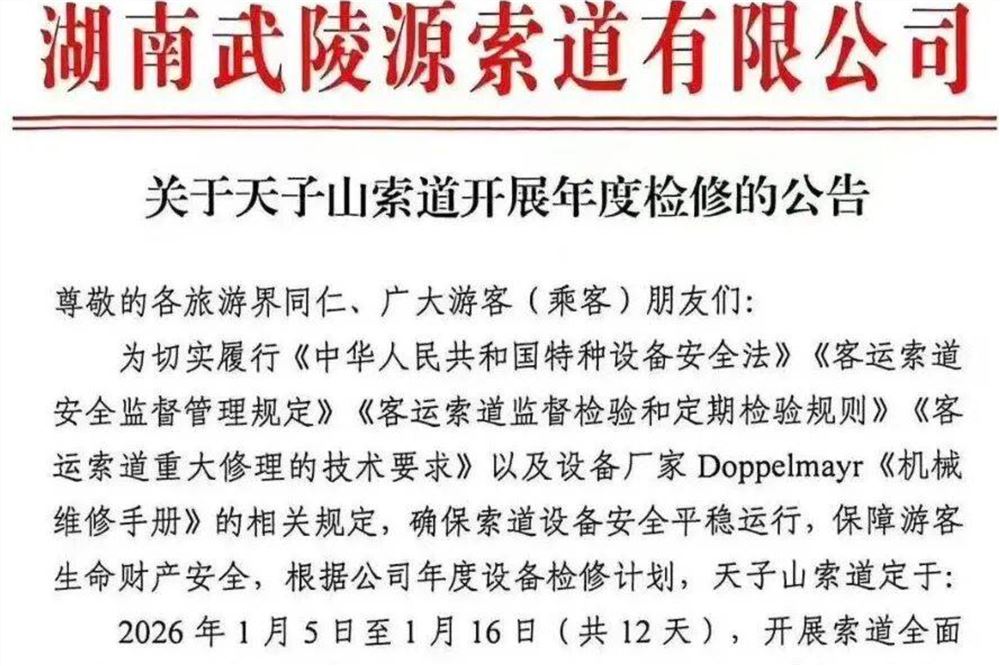 湖南武陵源索道有限公司对外发布消息,2026年1月5日至1月16日,位于张家界国家森林公园内的天子山索道全面检修维护,停运12天。索道停运期间,天子山景区正常开放,游客需提前规划游览行程,可选择步行上下山游览,也可选择乘百龙天梯或杨家界索道上山,转乘环保车到达天子山景区。