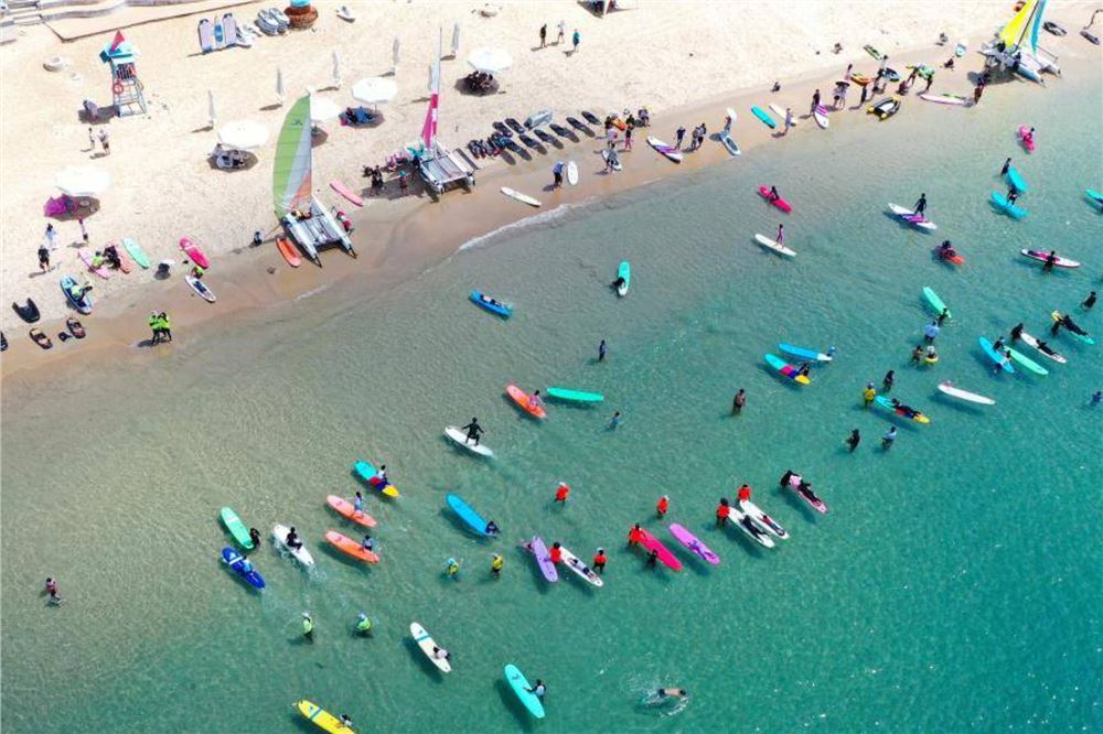 暑期,许多游客来到海南三亚,学习体验冲浪,感受与海共舞的乐趣。??8月10日,游客在三亚市后海村附近海域冲浪嬉水。
