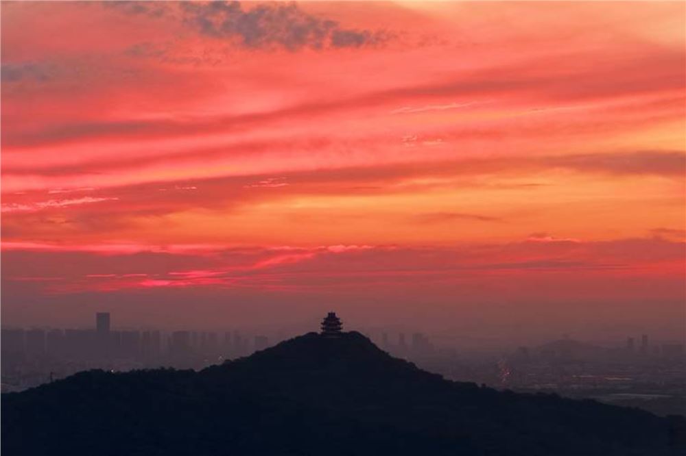 初秋时节,晨光初露,位于安徽省马鞍山市的采石矶风景区,仿佛一幅瑰丽的山水画卷。远处长江奔流浩荡,天边云层渐开,景色令人沉醉。