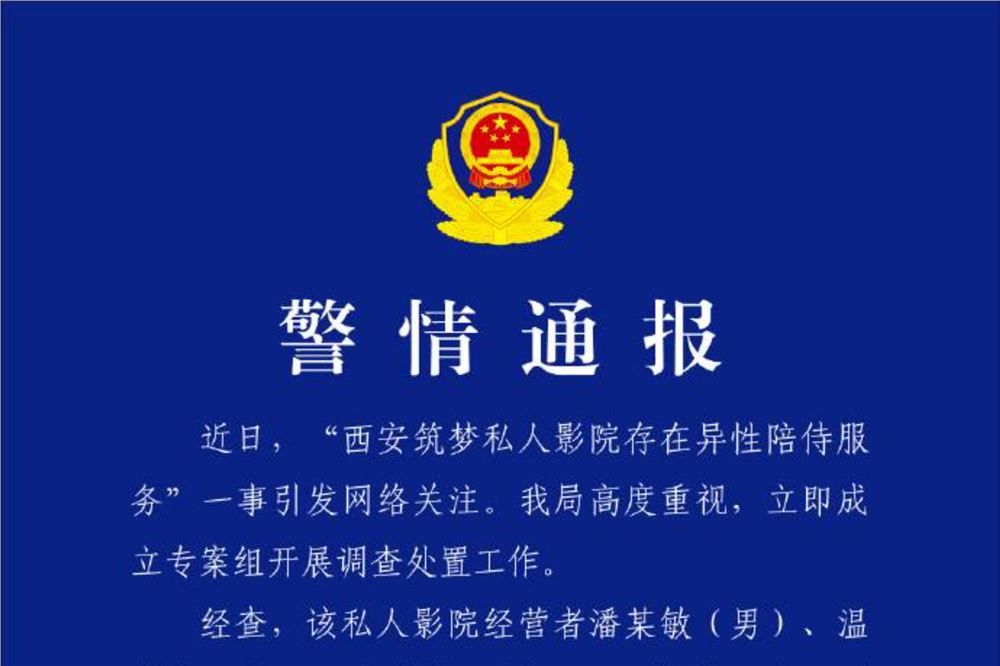 12月21日,西安市公安局雁塔分局发布警情通报称,近日,“西安筑梦私人影院存在异性陪侍服务”一事引发网络关注。我局高度重视,立即成立专案组开展调查处置工作。 目前,我局已依法对以上组织者及提供陪侍人员立案调查,相关人员全部到案,经营者潘某敏、温某宝、张某龙、王某静被依法刑事拘留,3名陪侍人员被行政处罚,案件正在进一步办理中。公安机关提醒各经营主体严格遵守法律法规,依法诚信经营。