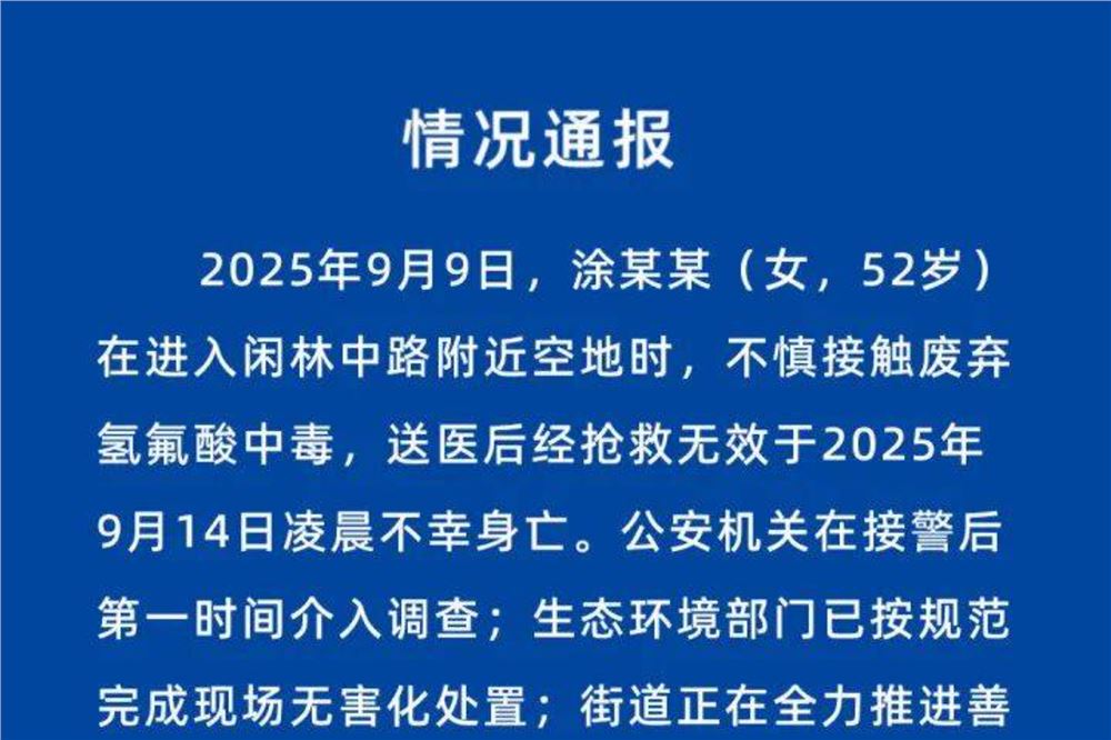 9月15日,杭州市余杭区闲林街道办事处发布情况通报,具体如下: 2025年9月9日,涂某某在进入闲林中路附近空地时,不慎接触废弃氢氟酸中毒,送医后经抢救无效于2025年9月14日凌晨不幸身亡。目前,事发原因正在进一步调查中。 据新华社此前报道,氢氟酸是氟化氢气体的水溶液,无色透明,有刺激性气味,具有极强的腐蚀性,能够腐蚀金属、玻璃和含硅的物体。