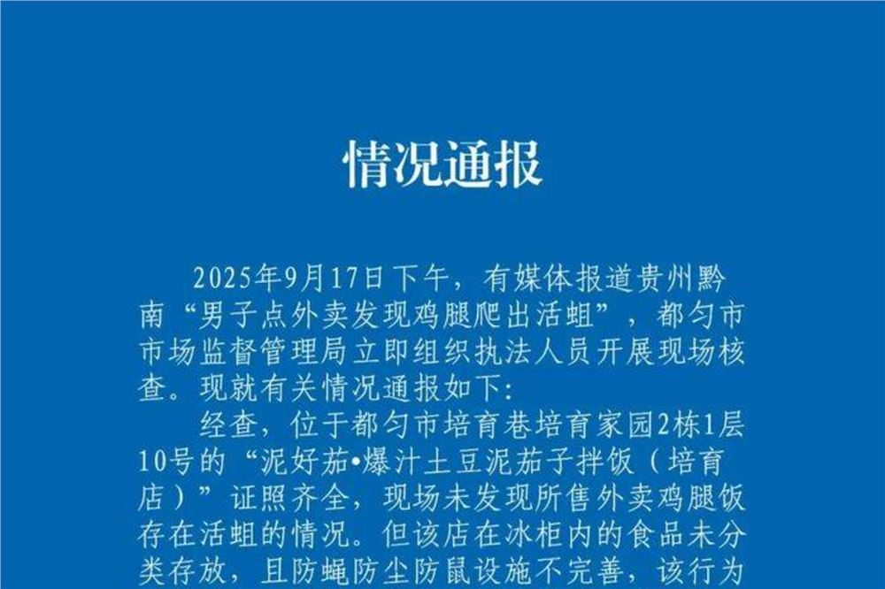 9月17日,有媒体报道贵州黔南“男子点外卖发现鸡腿爬出活蛆”,都匀市市场监督管理局发布核查情况通报: 经查,位于都匀市培育巷培育家园2栋1层10号的“泥好茄·爆汁土豆泥茄子拌饭(培育店)”证照齐全,现场未发现所售外卖鸡腿饭存在活蛆的情况。目前,都匀市市场监督管理局已立案调查,并督促该店及时整改。同时,涉事商家已自行停业整顿。