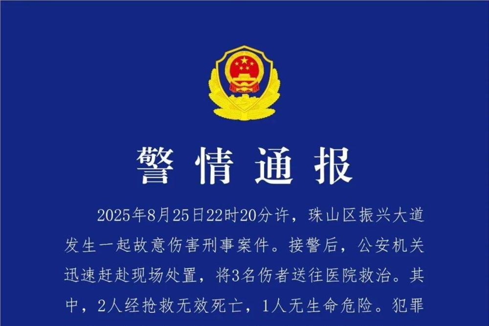 8月26日,珠山公安分局发布警情通报:2025年8月25日22时20分许,珠山区振兴大道发生一起故意伤害刑事案件。接警后,公安机关迅速赶赴现场处置,将3名伤者送往医院救治。 其中,2人经抢救无效死亡,1人无生命危险。犯罪嫌疑人李某某被公安机关及时控制。经初步调查,该案系因情感纠纷引发。目前,案件正在进一步侦办中。