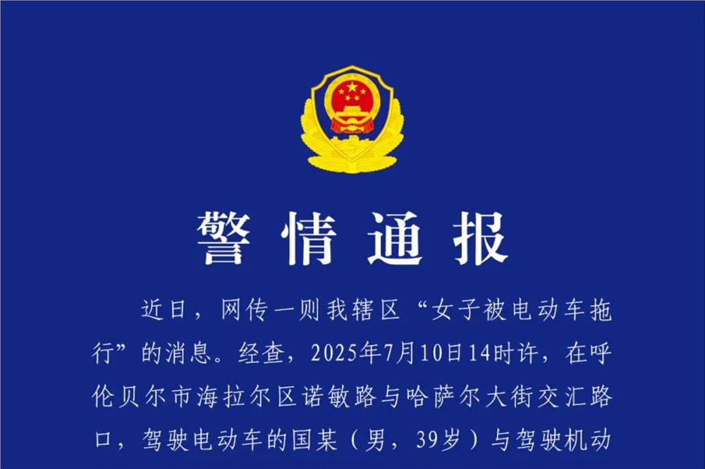 呼伦贝尔警方通报“女子被电动车拖行”:已对电动车驾驶员拘留并处罚款