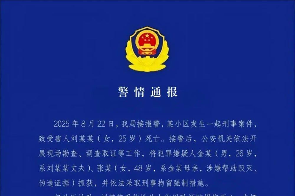 8月24日晚上,河北沧州孟村公安发布警情通报: 2025年8月22日,我局接报警,某小区发生一起刑事案件,致受害人刘某某死亡。同时,公安机关正在会同妇女权益保护部门,对刘某某被家暴相关情况深入开展调查。 此前报道: 8月22日,河北沧州孟村县疑有男子金某家暴妻子刘某某致死的消息引发关注。孟村县政府办值班人员称据其了解到的最新消息,刘某某已去世,目前警方正在处理此事。