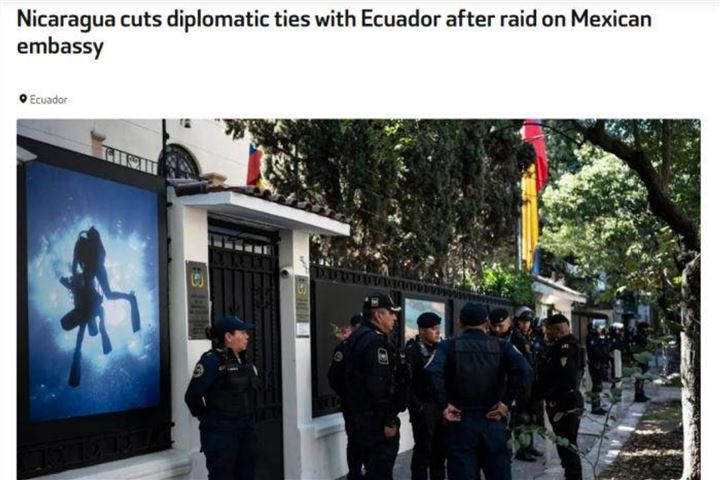 中新网4月7日电 据阿拉伯卫星电视台报道,当地时间6日,尼加拉瓜政府发布公告称,尼加拉瓜即刻起断绝与厄瓜多尔的外交关系。 公告还称,自公告发布起,尼方作出与厄瓜多尔政府正式断绝所有外交关系的主权决定,并强调对国际法和国际公约的重视。墨西哥外交部长巴尔塞纳随后宣布,鉴于厄方公然违反《维也纳外交关系公约》及墨西哥驻厄外交人员所受伤害,墨西哥立即断绝与厄瓜多尔的外交关系。
