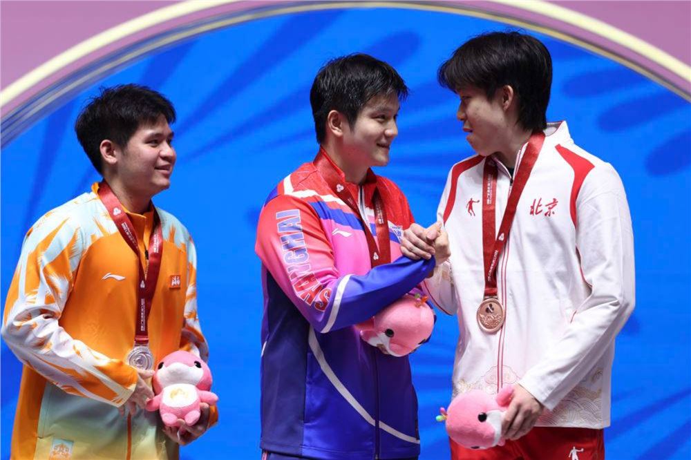 这天,距离樊振东站上巴黎奥运会最高领奖台已过去469天。11月16日,冠军上海队选手樊振东在颁奖仪式上。2017年天津全运会,樊振东搭档周雨,在男双决赛中经历七局鏖战,力克马龙/许昕,成功卫冕。2021年陕西全运会,樊振东再添男团、男单两金。2021年9月21日,广东队选手樊振东获胜后庆祝。 本届全运会乒乓球单打赛场,樊振东五战全胜,“打服”了所有人。 本届全运会赛场外,发生过一段关于樊振东的暖心插曲。