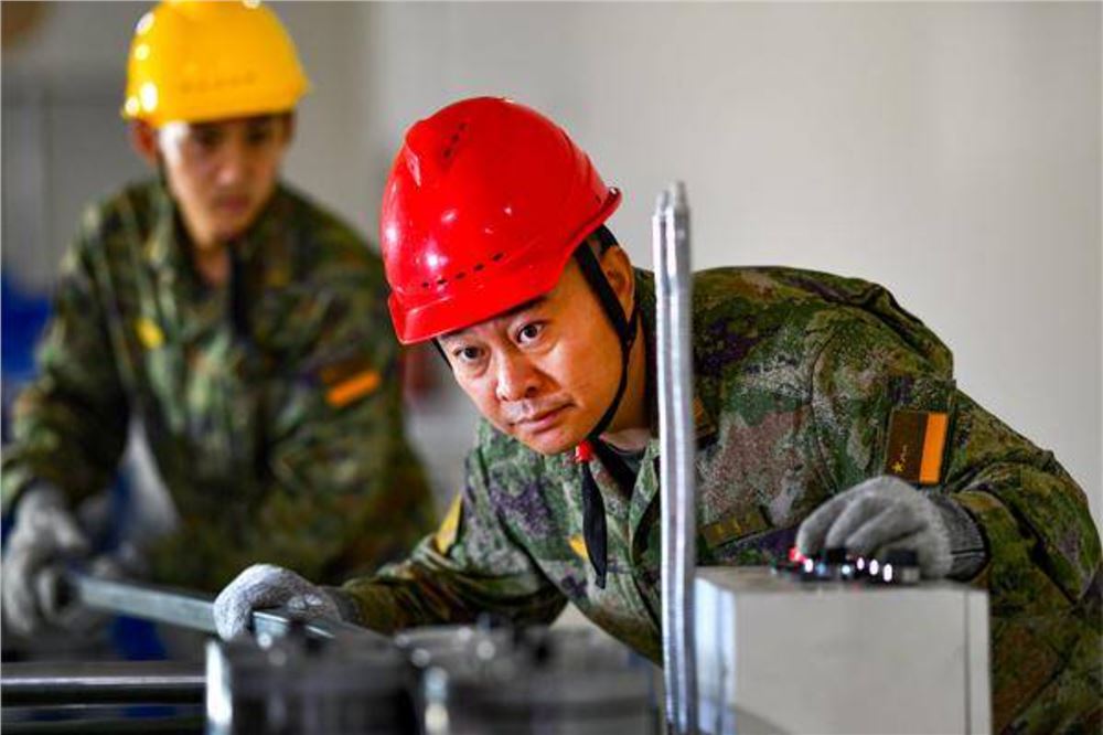 火箭军某旅一级军士长崔道虎(右一)调试革新设备。9月3日,纪念中国人民抗日战争暨世界反法西斯战争胜利80周年大会隆重举行,火箭军多型导弹在北京天安门广场震撼亮相,令国人为之振奋。在火箭军某旅的一处营区内,收看阅兵直播的一级军士长崔道虎,通过屏幕看到这些不曾亲眼见过的火箭军装备,心潮澎湃、激动不已。 安装进行到第6个小时,崔道虎右手食指被挤压得开始发紫。