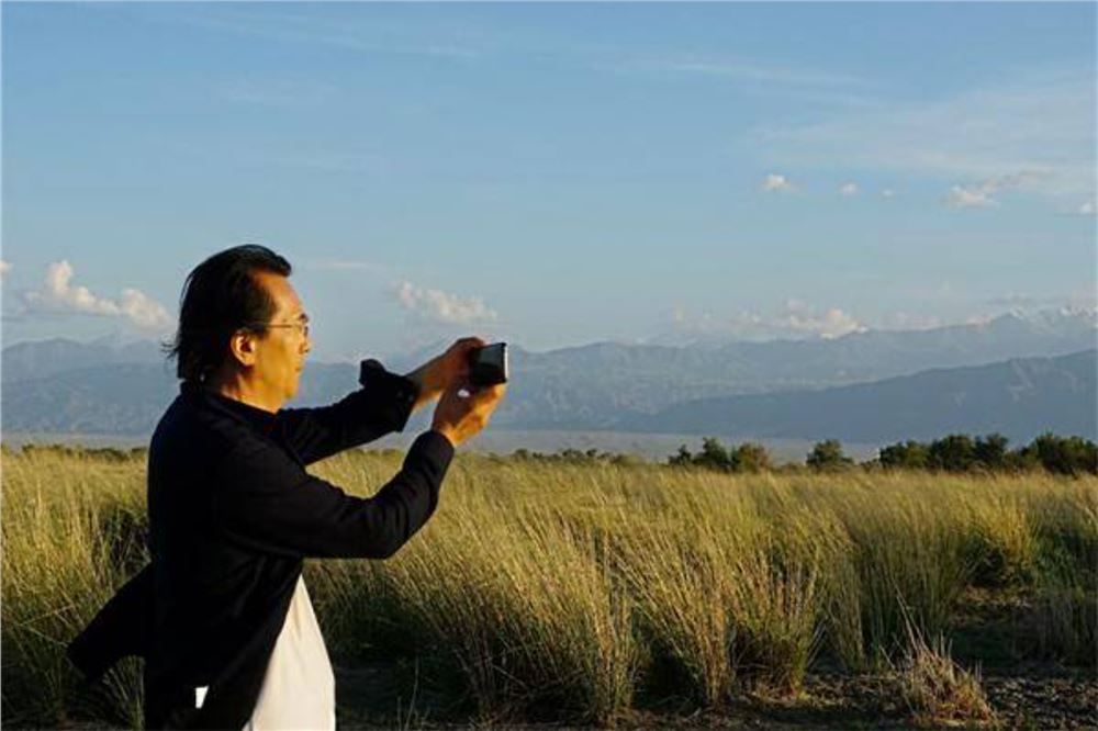 何建明在新疆乌苏的戈壁滩上拍下“沙漠变绿洲”。 何建明:70年的新疆,首先是一部壮丽的共和国新疆史,不写这样的历史,肯定失色。70年的新疆,有着如诗如画的景象。