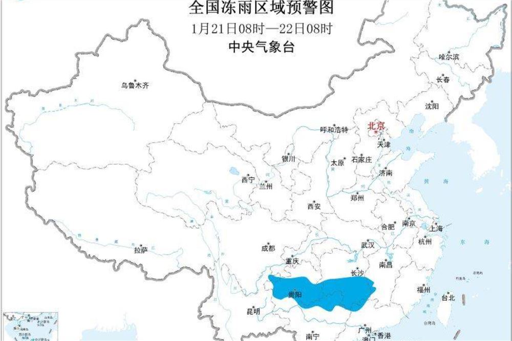 中央气象台1月21日06时继续发布冰冻黄色预警:预计,1月21日08时至22日08时,贵州中东部和西北部、湖南中南部、广西北部、广东西北部、云南东北部、江西西部等地的部分地区有冻雨或冰粒,上述大部地区冻雨量1~2毫米,其中湖南西南部、贵州东南部、广西北部部分地区3~5毫米,局地可达6毫米以上。