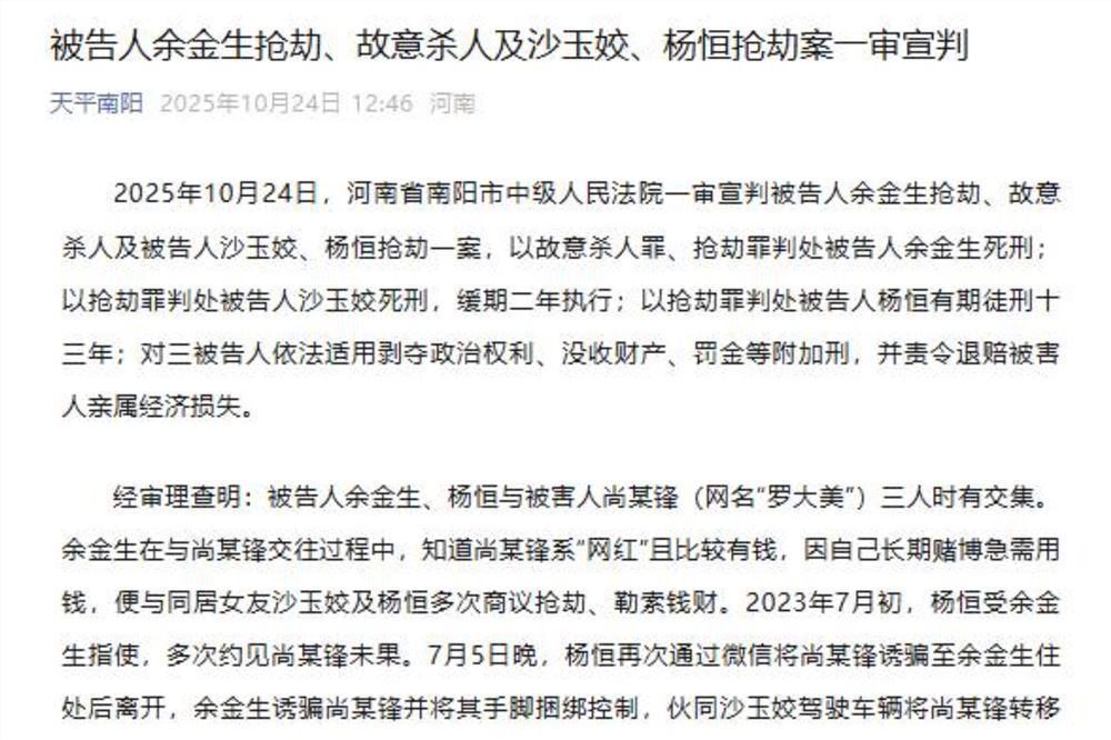 经审理查明:被告人余金生、杨恒与被害人尚某锋三人时有交集。 南阳中院审理认为,被告人余金生、沙玉姣、杨恒以非法占有为目的,采用暴力手段抢劫他人财物,数额特别巨大,其行为均已构成抢劫罪,且系共同犯罪。余金生在抢劫被害人财物后杀人灭口,其行为又构成故意杀人罪。据三被告人的犯罪事实、犯罪性质、情节和对于社会的危害程度,遂依法作出上述判决。