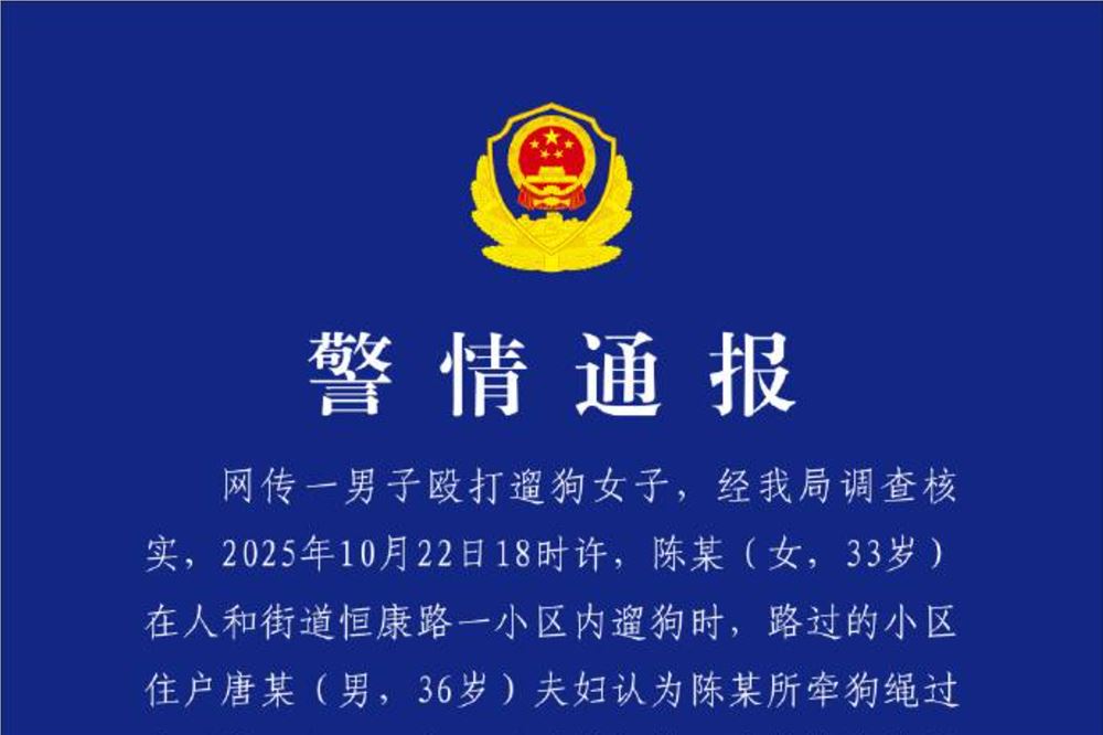 10月23日,重庆市公安局两江新区分局通报: 网传一男子殴打遛狗女子,经调查核实,10月22日18时许,陈某在人和街道恒康路一小区内遛狗时,路过的小区住户唐某夫妇认为陈某所牵狗绳过长干扰通行,双方互骂引发抓扯,唐某将陈某推搡倒地并进行殴打。目前,公安机关已立案,正进一步调查处理中。