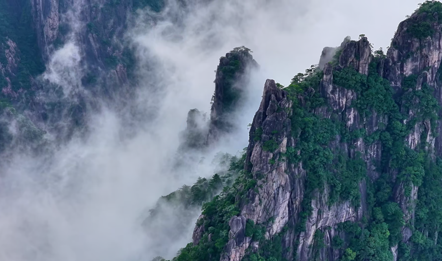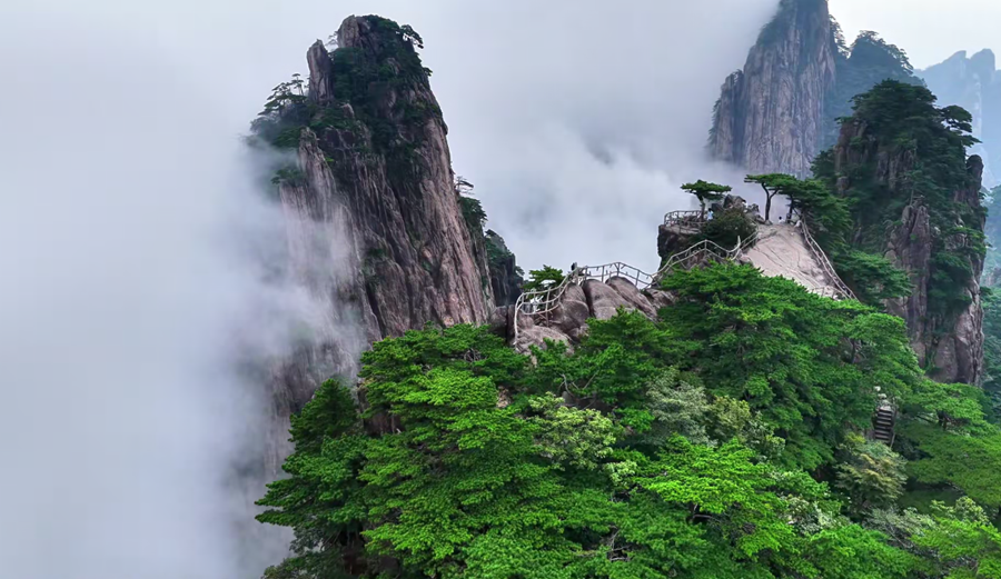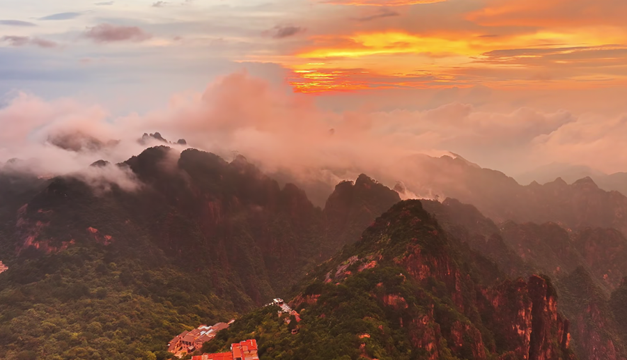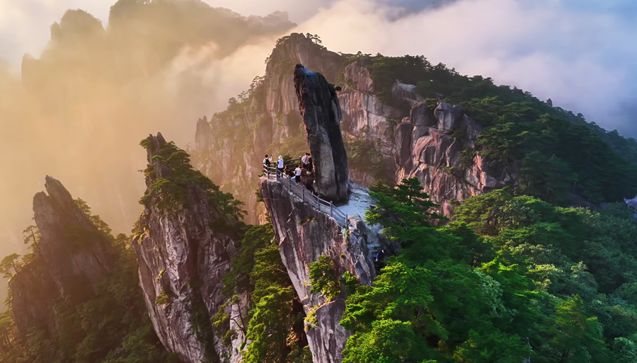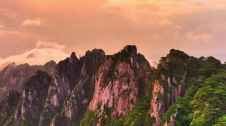 近日,安徽省黄山风景区朝云抱岫、松涛叠翠,接天霞色染金泼彩,宛若天开画卷,美不胜收。(吴文贵)
