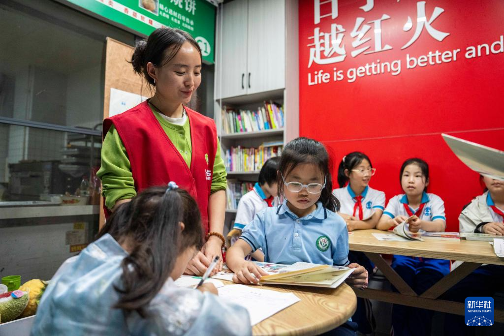4月23日,志愿者在长沙华夏农贸市场“四点半角”辅导学生功课。