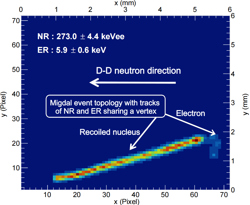 米格达尔效应由苏联著名物理学家阿尔卡季·米格达尔于1939年首次提出:一个原子的原子核突然获得能量加速运动时,原子核在反冲过程中的内部电场变化将部分能量转移给原子核外电子,使电子有概率获得足够能量脱离原子束缚,形成“共顶点”的两条带电径迹。