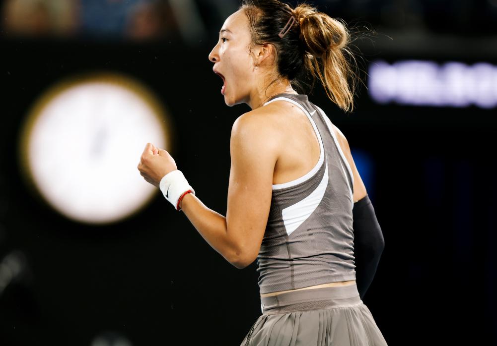 1月12日,郑钦文在比赛中庆祝得分。新华社记者 马平 摄