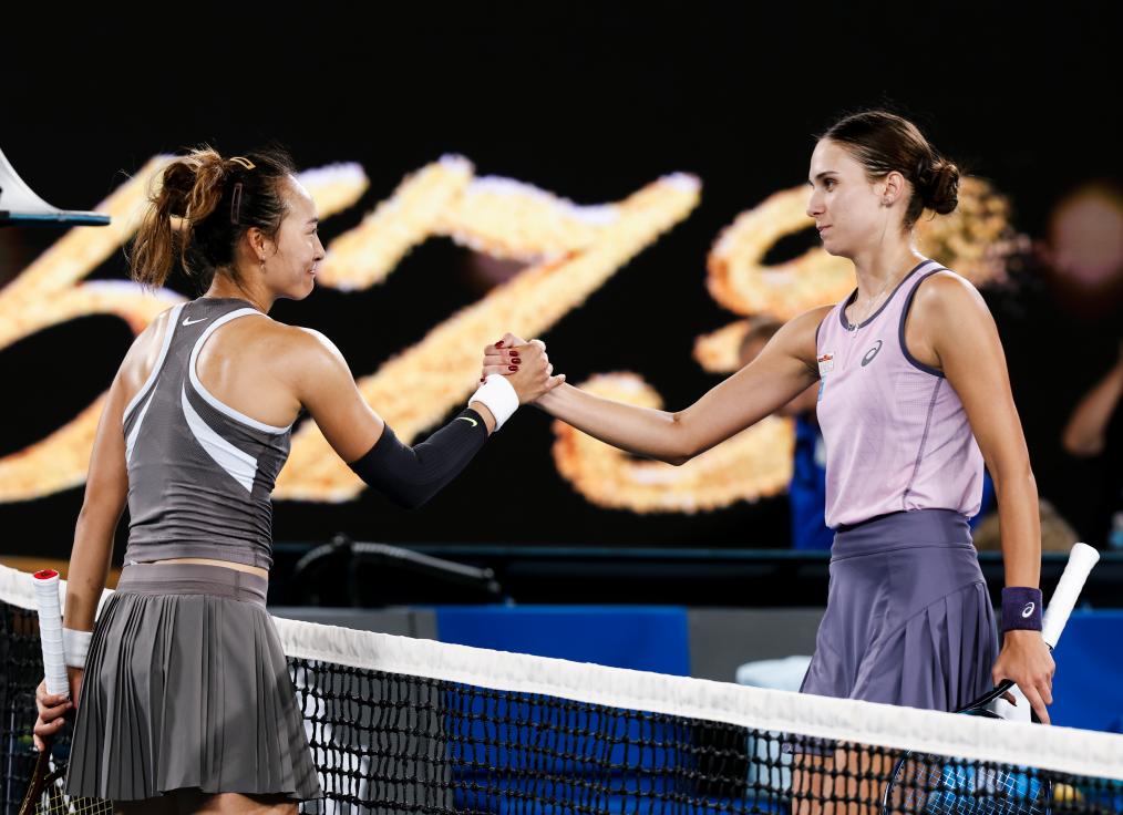 1月12日,郑钦文(左)与托多尼赛后握手致意。新华社记者 马平 摄
