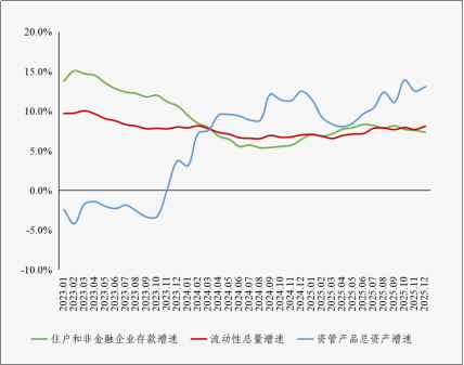 住户和非金融企业存款、流动性总量、资管产品总资产增速情况