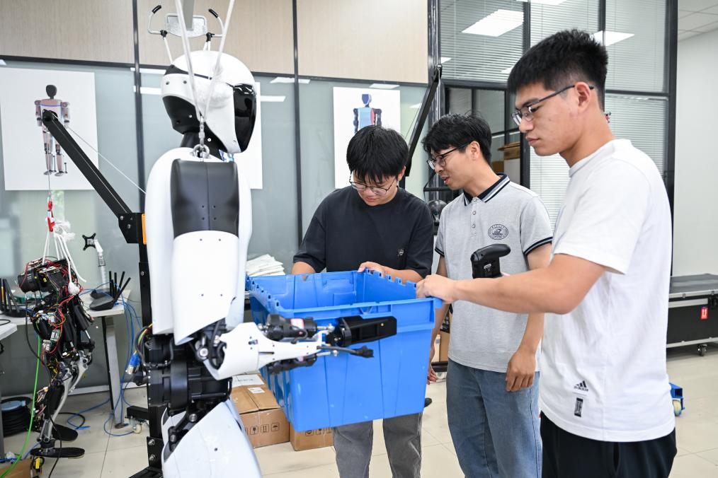 2025年5月29日,华中科技大学机械科学与工程学院,学生对“荆楚”人形机器人进行搬运测试。新华社记者 杜子璇 摄