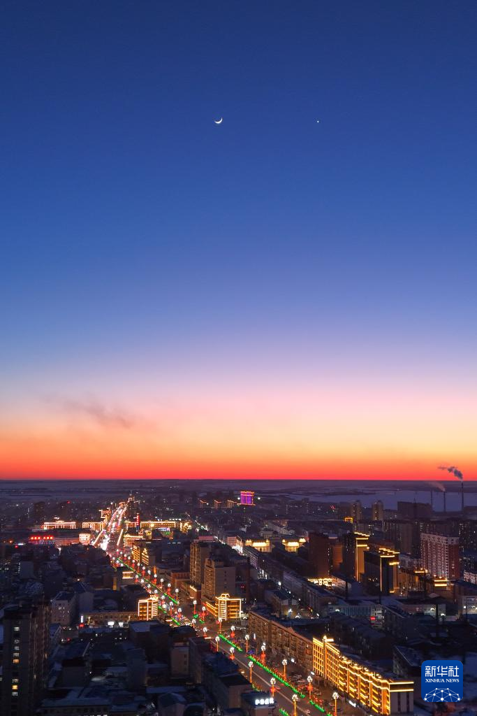 3月2日在黑龙江省富锦市拍摄的金星伴月(无人机照片)。新华社发(曲玉宝摄)