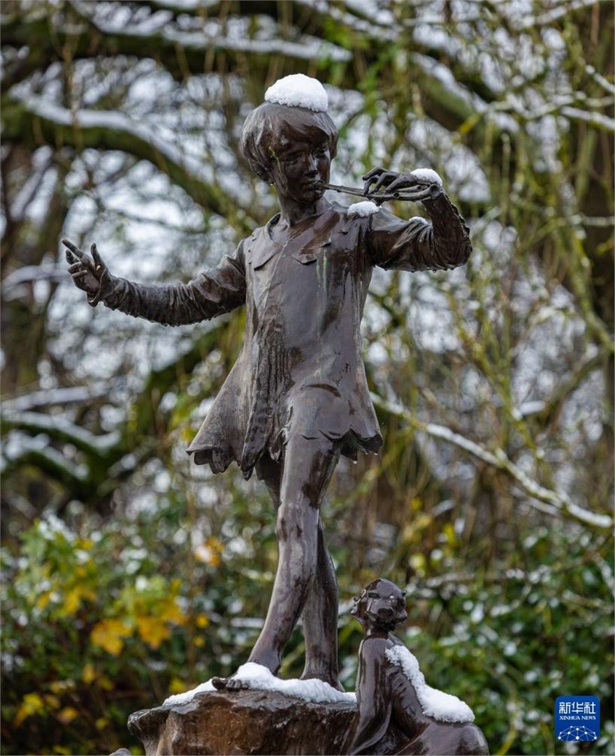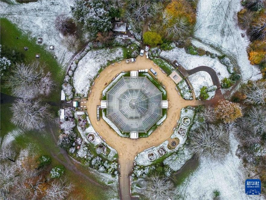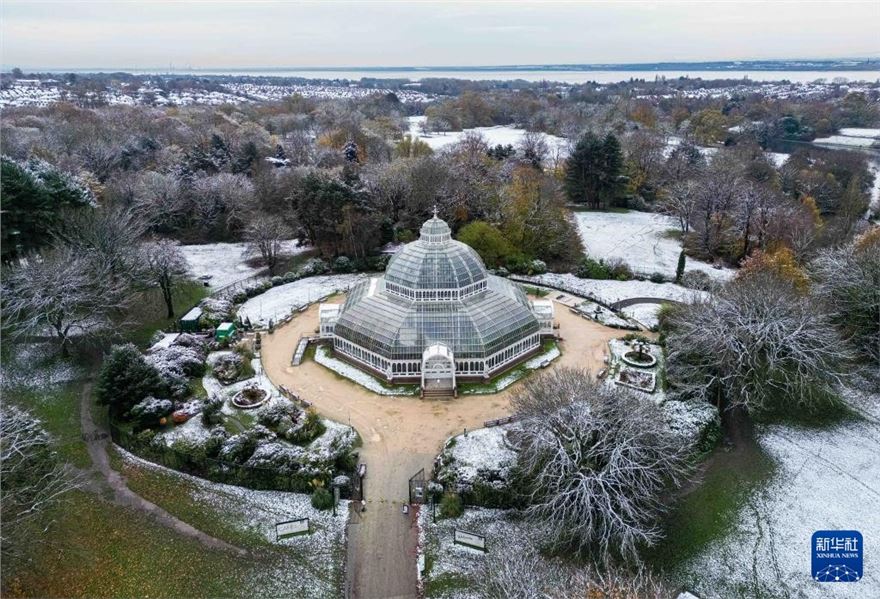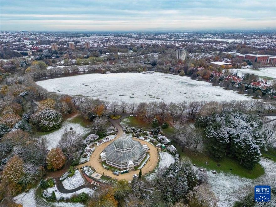 这是11月19日在英国利物浦塞夫顿公园拍摄的雪后景色(无人机照片)。