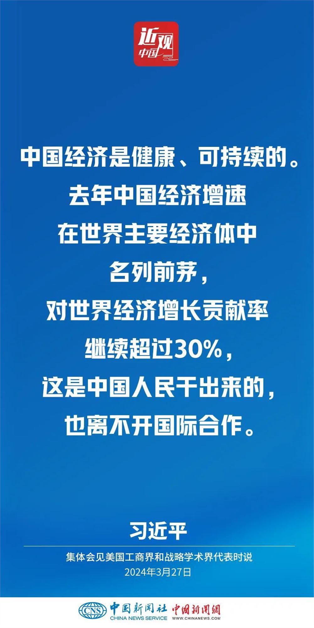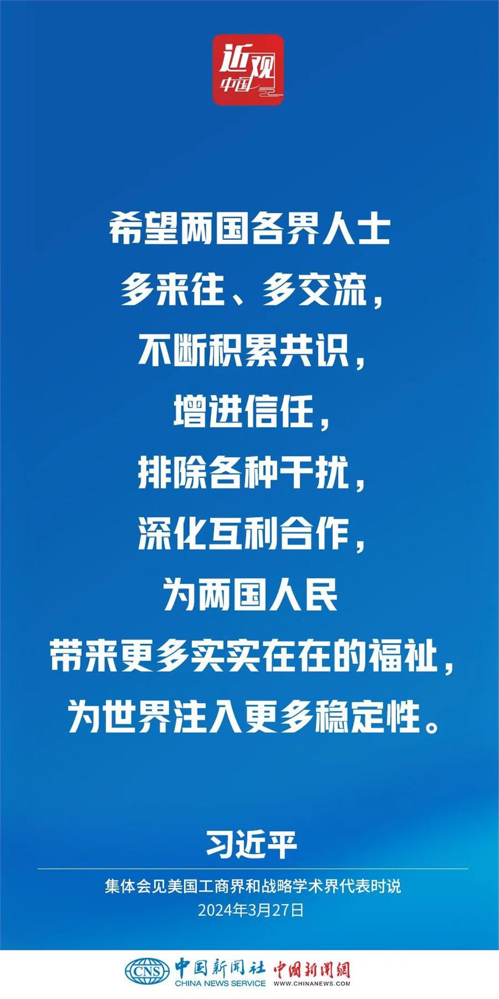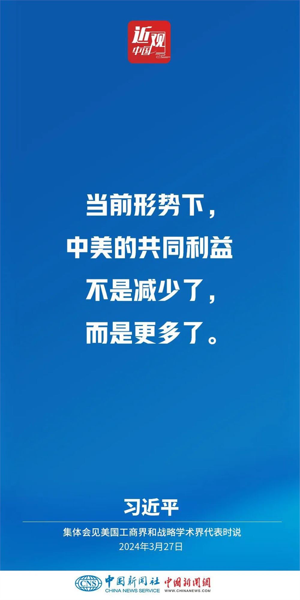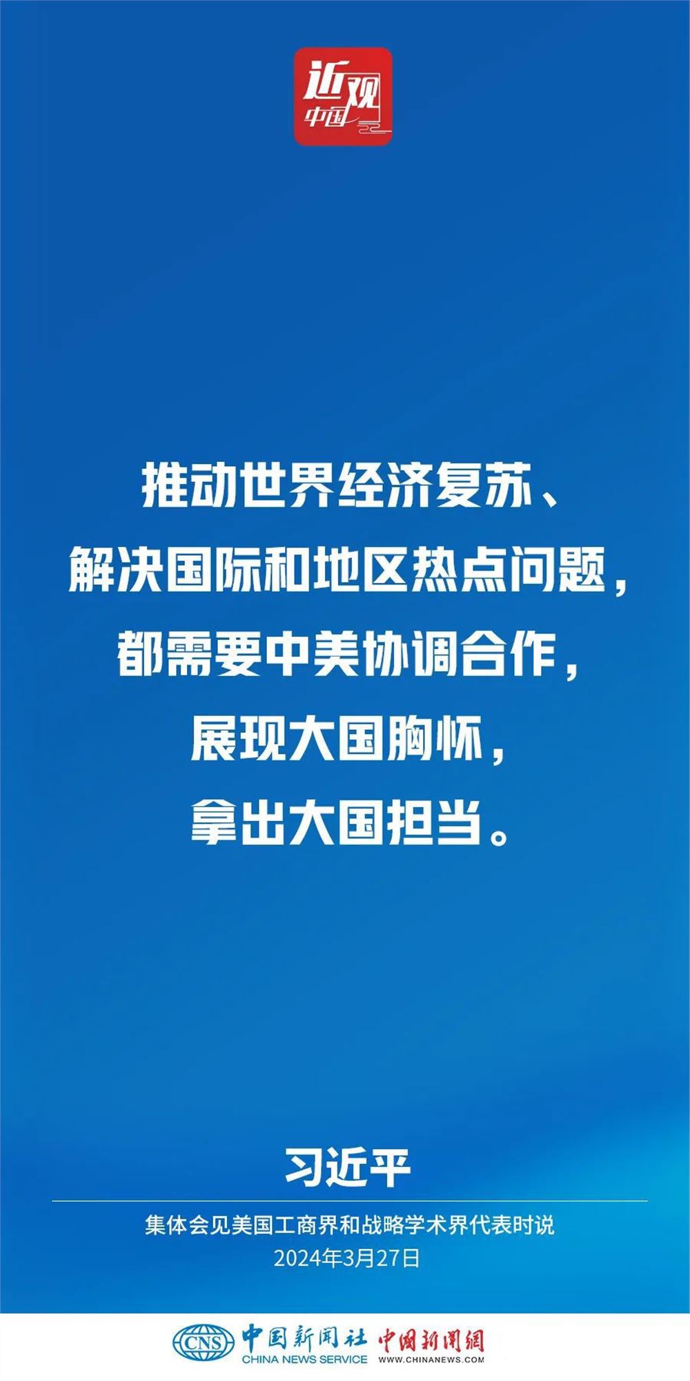 3月27日,国家主席习近平在北京人民大会堂集体会见美国工商界和战略学术界代表。习近平指出——