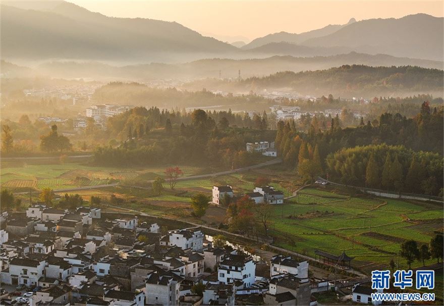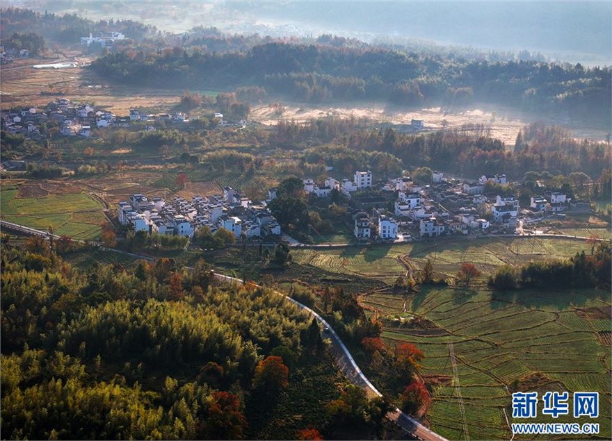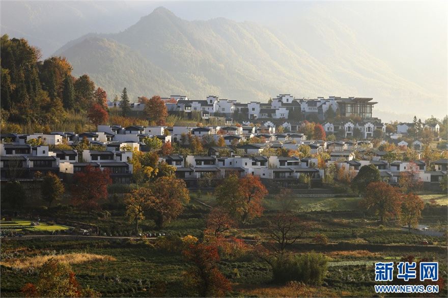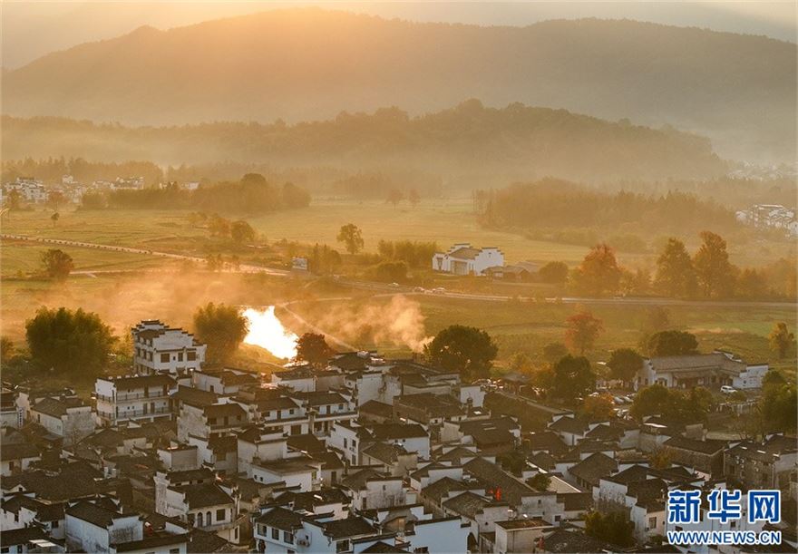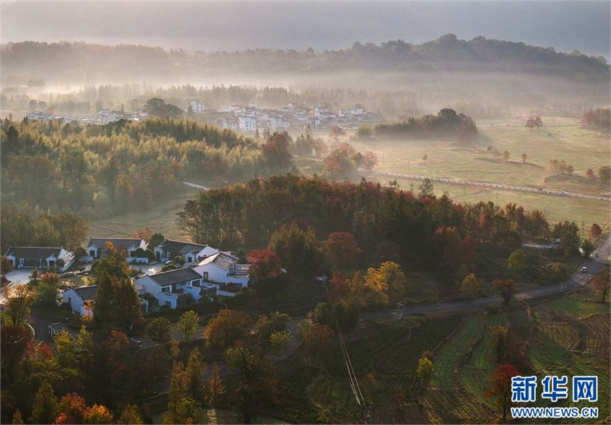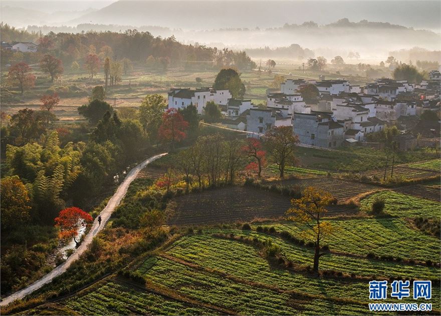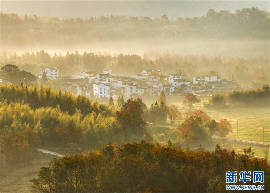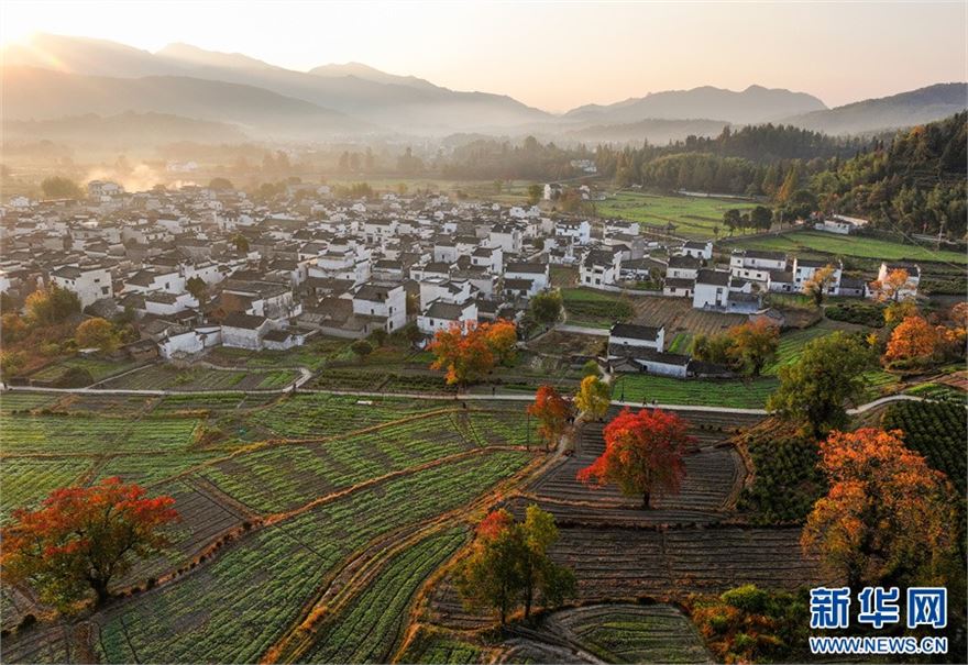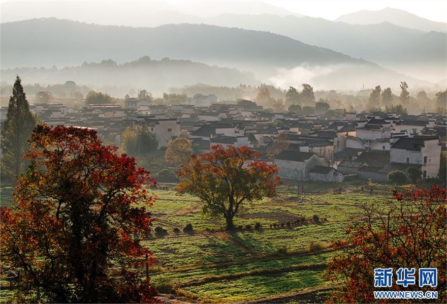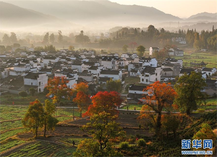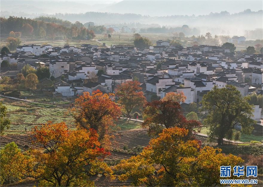 初冬的早晨,安徽省黄山市黟县卢村云雾缭绕,色彩斑斓的乌桕树叶与鳞次栉比的徽派民居交相辉映,景色旖旎,令人流连忘返。