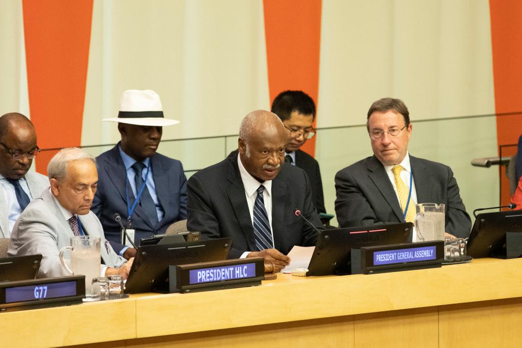 9月12日,在位于纽约的联合国总部,第79届联合国大会主席菲勒蒙·扬(前排中)在联合国南南合作日高级别讨论会上致辞。新华社记者 谢锷 摄