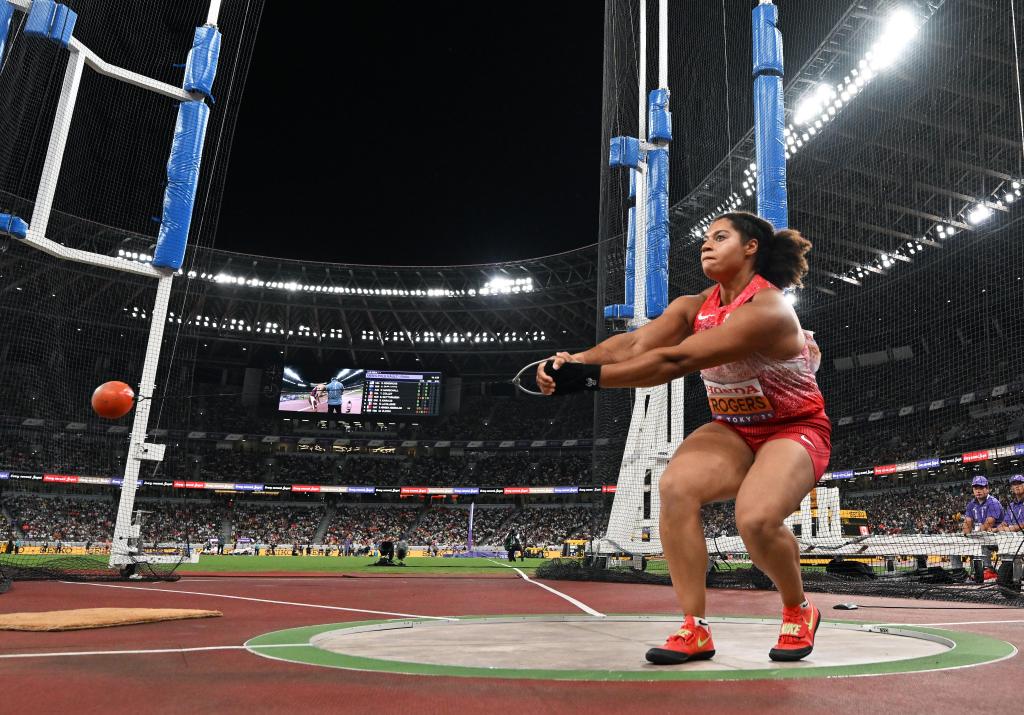 9月15日,加拿大选手罗杰斯在决赛中试投,最终她获得冠军。新华社记者 宋彦桦 摄