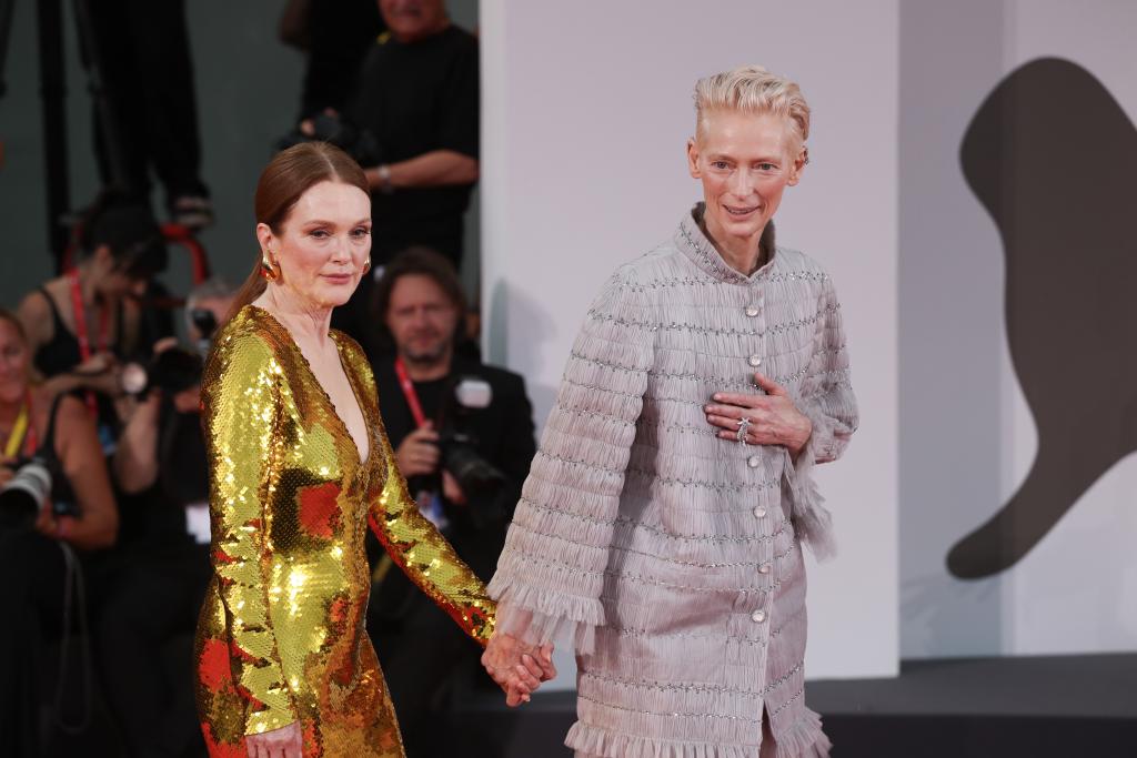9月2日,在意大利威尼斯举行的第81届威尼斯国际电影节上,主竞赛单元影片《隔壁房间》演员朱丽安·摩尔(左)和蒂尔达·斯文顿亮相首映式红毯。新华社记者 李京 摄