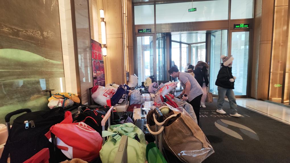 哈尔滨一洗浴中心内,工作人员正在搬运行李。新华社记者 张启明 摄