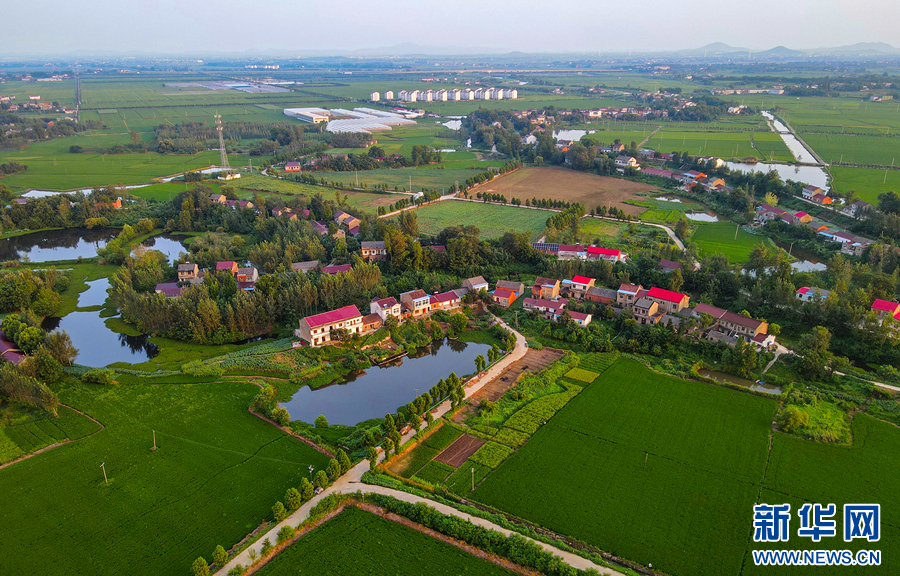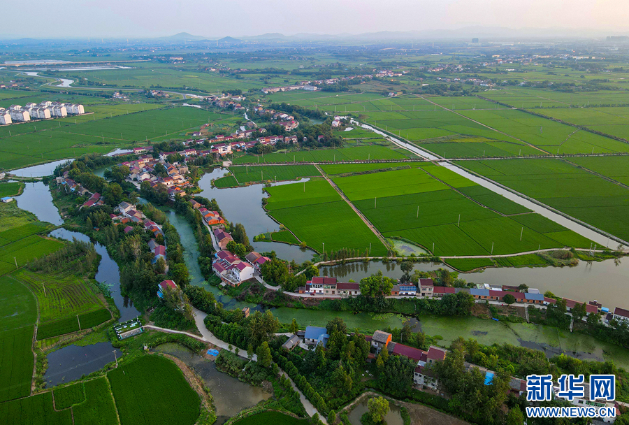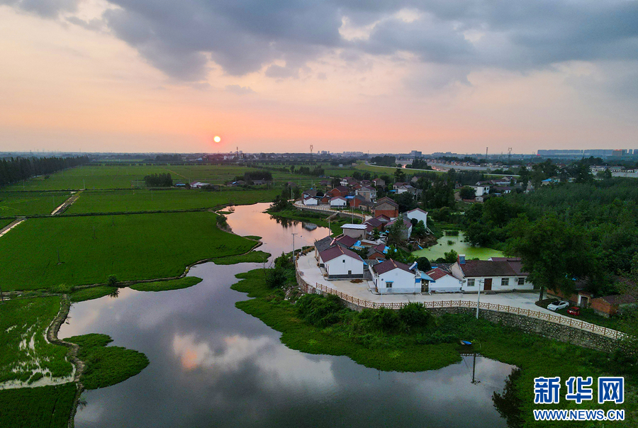 近日,在安徽省合肥市庐江县郭河镇,夕阳下的稻田与村舍、河流相映成趣,景色如画,构成一幅美丽宜居的乡村新画卷。