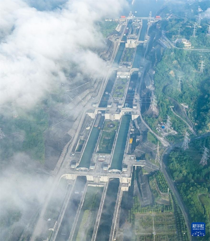 船舶有序通过三峡双线五级船闸(6月30日摄,无人机照片)。