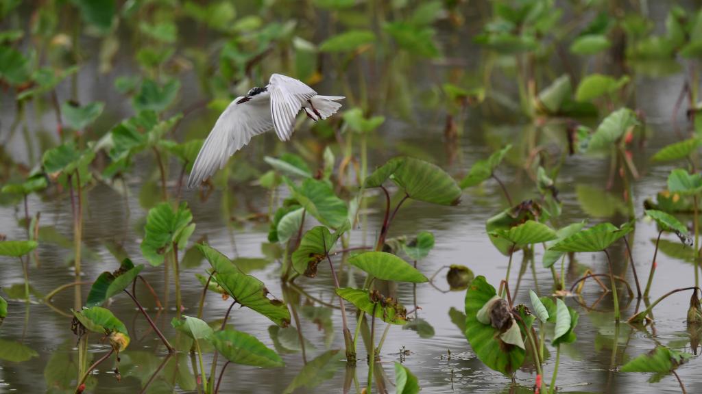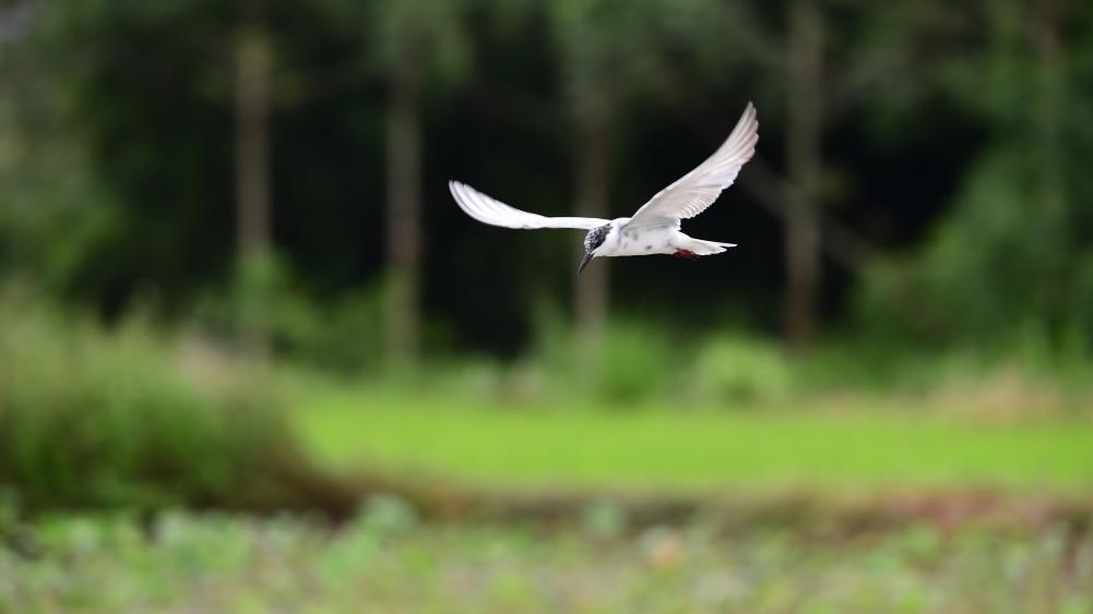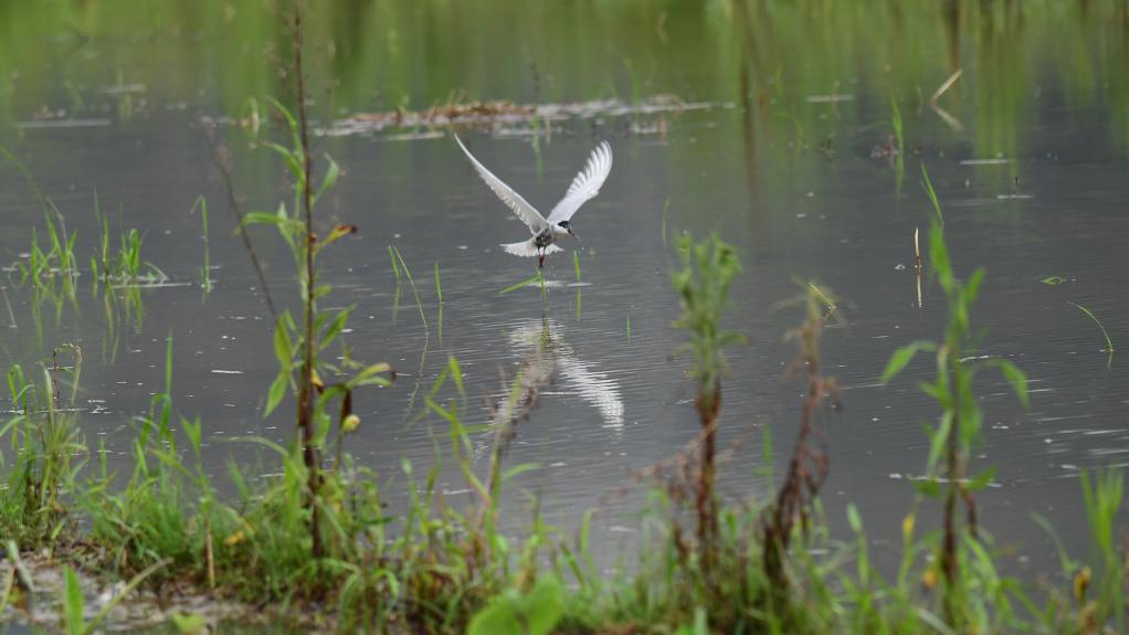 ↑2024年6月11日,须浮鸥在广西贺州市昭平县昭平镇龙坪村一片湿地上空捕食。CICPHOTO/左德强 摄