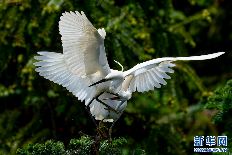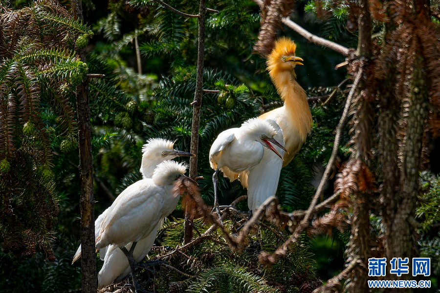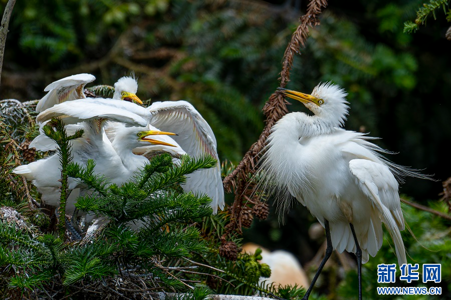 近日,在云南省保山市昌宁县,数千只白鹭和牛背鹭在这里安家筑巢,有的产卵、孵化,有的已经破壳,甚至出窝学习飞行。(完)(范芳钰 李钰泽)