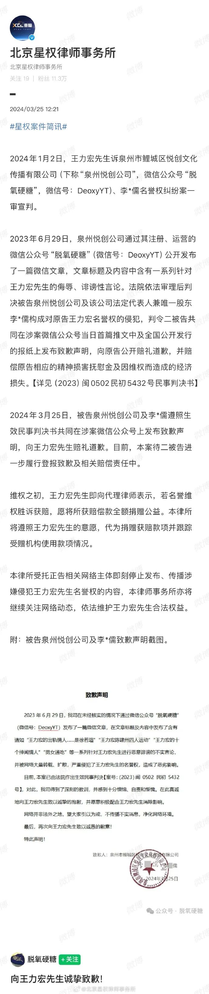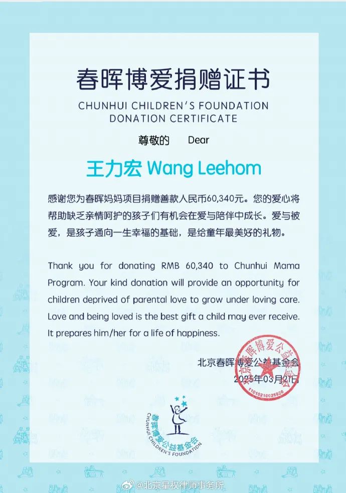 3月22日,北京星权律师事务所发文表示:3月21日,该所遵照王力宏意愿,将(2023)闽0502民初5432号名誉维权案所获赔偿款共计60340元全额捐赠至春晖博爱公益基金会“春晖妈妈”项目。