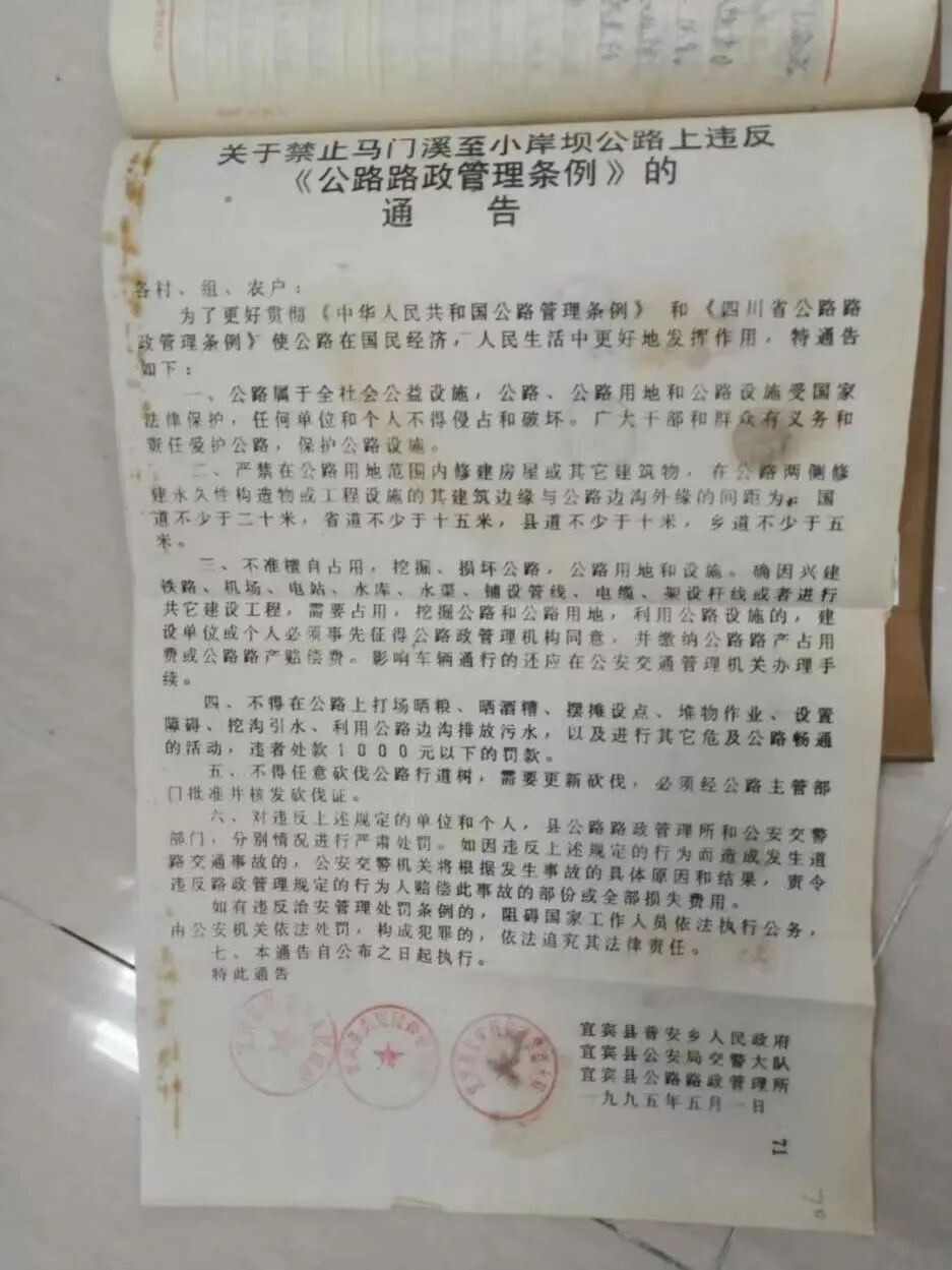 当地的融媒体中心编辑很较真地钻进史料里求证。他们在政府档案中查到一份1954年宜宾县人民政府印发的《马门溪码头渡船超载失□造成损失的通报》,一份1982年四川省宜宾地区交通局《关于同意接养马鸣溪至小岸坝管道公路的复函》,以及一份1995年宜宾县多部门印发的《关于禁止马门溪至小岸坝公路上违反<公路路政管理条例>的通告》,可见至少上世纪50年代至90年代,当地对于“马鸣溪”或“马门溪”两种用法皆有。