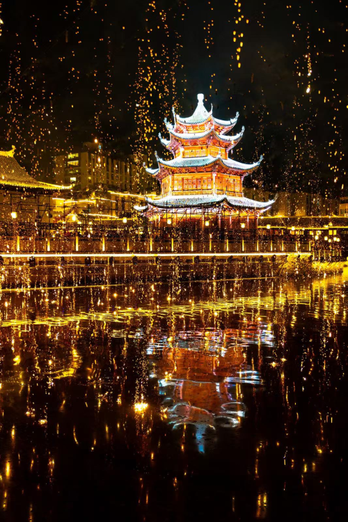 南官河上,非遗落花秀惊艳开场,点点火花如星河璀璨,随风而舞,在夜空中倾落;新春大戏《禧乐长街 福地路桥》连接路桥在地文化,为游客们演绎宋时十里长街廿五间的故事。