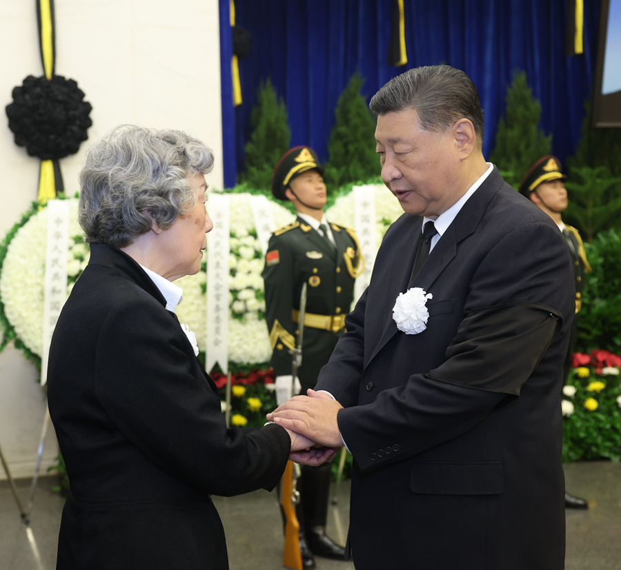 10月14日,吴邦国同志遗体在北京八宝山革命公墓火化。习近平、赵乐际、王沪宁、蔡奇、丁薛祥、李希、韩正等前往八宝山送别,胡锦涛送花圈表示哀悼。这是习近平与吴邦国亲属握手,表示深切慰问。