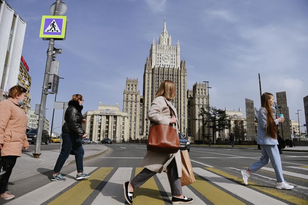 2021年4月16日,在俄罗斯首都莫斯科,行人从俄罗斯外交部大楼附近走过。新华社发(叶甫盖尼·西尼岑摄)