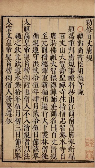 《百丈清规》的确立者——百丈怀海(720—814)祖师。百丈怀海,俗姓王,名木尊,福建长乐人,中国禅宗史上最重要的人物之一。怀海早年在广东潮安依慧照和尚出家,后至南岳衡山依法朝律师受具足戒,再后来至安徽庐江浮槎寺研读经藏十余载,积累了深厚的经、律、论知识。