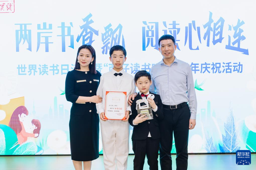 2024年4月19日,台商杜俊毅(右一)全家在长沙市芙蓉区西湖社区举办的世界读书日活动中被评为“书香家庭” 。新华社发