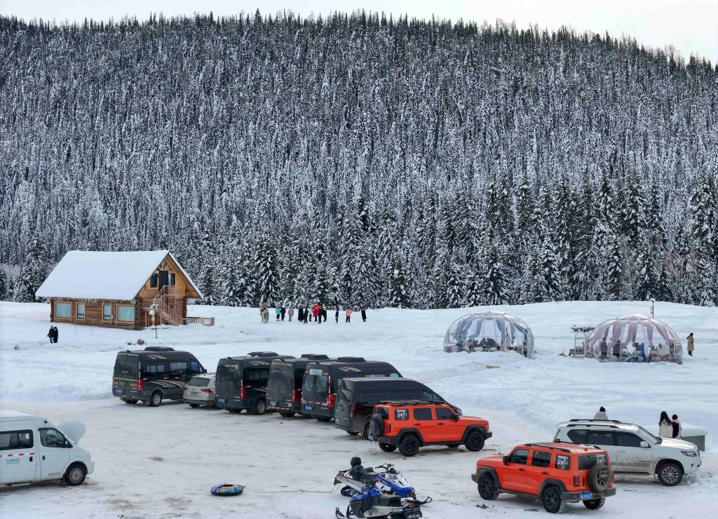 车辆随着曲折的山路在白雪间蜿蜒前行,透过覆雪的林木,远远望去,灵动跳跃。据喀纳斯景区公安局交警大队统计,今年入冬后,进入禾木村的车辆每天约有1000辆次,人员约3000人次。